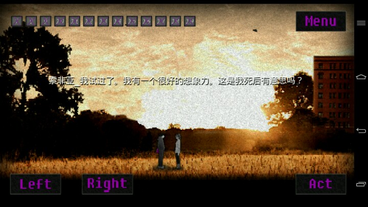 游戏用简单的按键,来向你展示了了一个风骚少年如何上学,读报,吃饭,睡觉,撩妹,读报,吃饭,睡觉,读报,吃饭,撩妹,睡觉,读报,住院,睡觉,参加葬礼,坐车跑路然后挂掉。挂掉后遇见了先前同样挂掉的妹子,然后过上了幸福的生活的既不中二又不狗血还有些感人的故事。