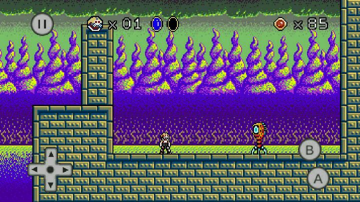 这是一款非常复古的横版像素风格动作闯关游戏,游戏有种《超级玛丽》既视感,主角像《恶魔城》里的角色一样用鞭子攻击,在充满怪物的异星冒险。