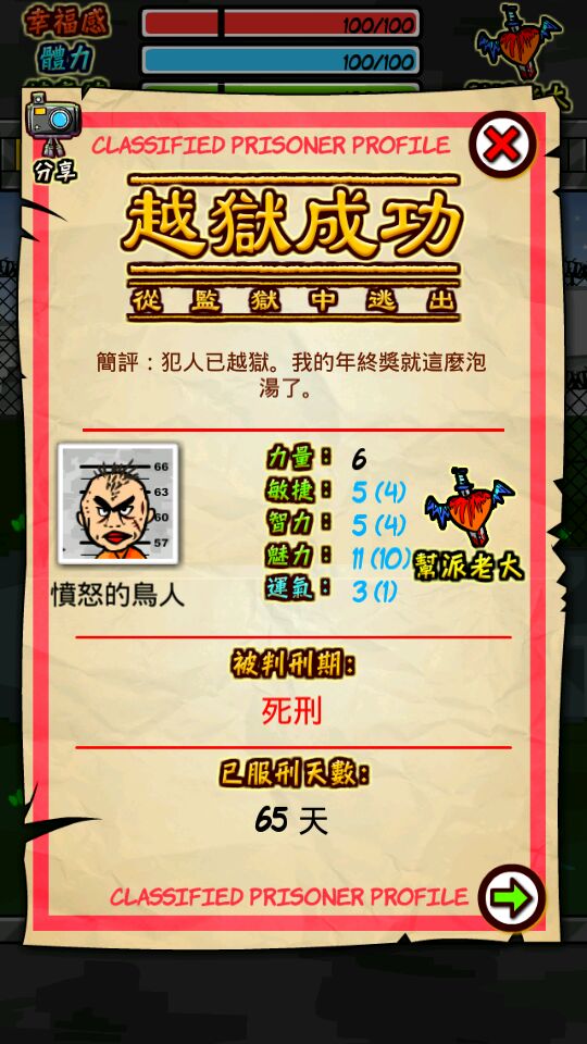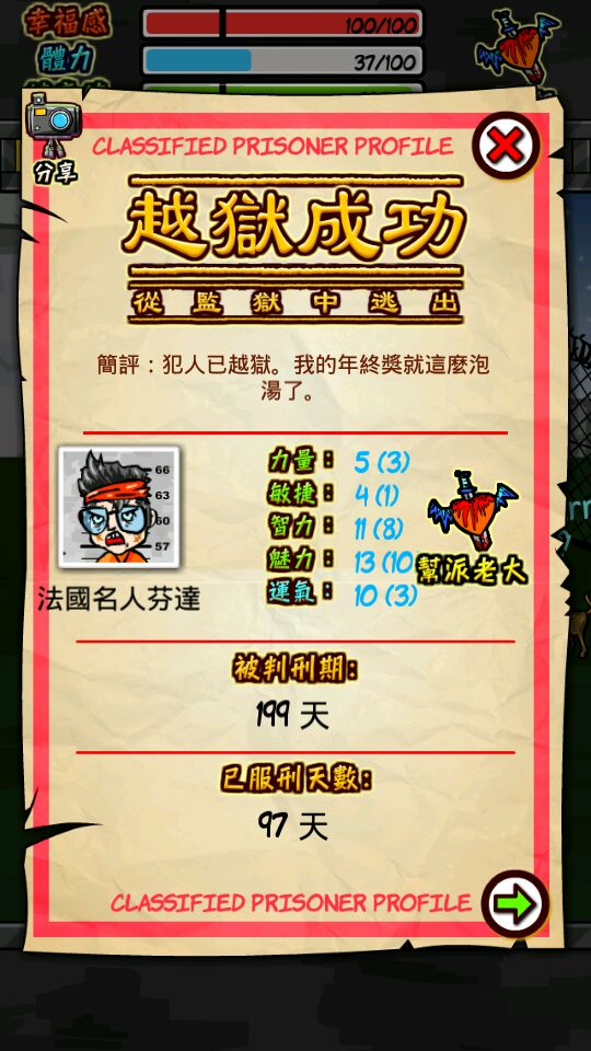 第二个人就是,法国牌的芬达,只有他一个是特殊犯人,这人其实不难操作。一上来照例加心碎帮,学调情,最好先把警察贝利的关系达到100,给10块进入监狱长办公室工作,晚上学习下棋和赌博,最好再学个开锁,学完后钱达到500就去金钱帮出老千一次出500,有钱后就贿赂各个警察以铺设后路,不学格斗技的话就去打小报告,达到 70就够了,也可以达到100不过那样你就解放了,之后学格斗技,健身和杀手,再去让医院里的老太婆给你强化一下(芬达力量和敏捷特低必需强化),还有一点,老虎机是以你当前点数为底数,比如说转力量点数,如果你力量在5那么它最低转5,最高10,如果在10以上,那么它每次都转你的当前点数,芬达敏捷就1,力量才2,那么它偷窃或者打架都是特别吃亏的,所以各个商店里的特殊物品都是必须买的,要不你技能再厉害还不如人家三个老虎机都是10厉害,芬达的智力可以达到11,魅力达到13,也就是说在语言方面没人比他厉害,也代表芬达杀人可以带手枪(最高杀伤武器,第二是黑寡妇),芬达如果是杀人越狱的话手枪再合适不过了。