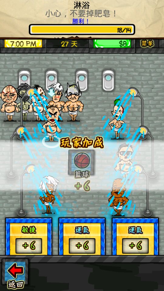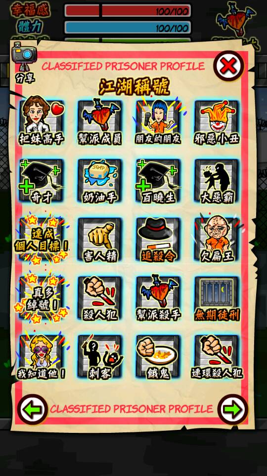 刚玩只能用第一排人,我比较推荐小丑,鉴于新手不会赚钱,靠他来生存再合适不过了,每天200块还带一个笑话,初期就加心碎帮,学偷窃(小丑社交很快的4次就100了),学好偷窃就把装病药买了,健康值不够就吃药,进医院以后偷大补丸和装病药(小丑敏捷不高,一天只能偷两次),就这样一直学你目前需要的技能,学到不用进医院都可以抗揍为止,小丑只有20天刑期,不想玩的话他钱多可以打给律师,律师一会就把他保释出来了。