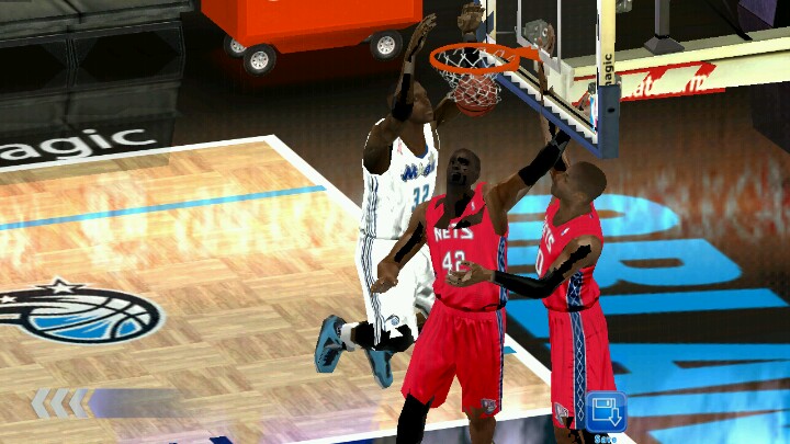 奥尼尔在45度角背身接球后,先观察一下场上局势,如果三秒区没人的话,便开始运球突破,在脚踩到三秒区时快速按两次投篮就可以完美的转身过人,这时候一般都会面对篮筐,不要多说,用方向键对准篮筐,长按投篮键来一次暴力扣篮吧。