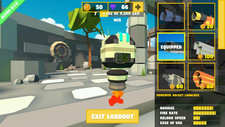 武器的话除了初始武器目前只用过40金币的powerful rocket launcher,优点是攻击高,缺点是子弹太少,只有4颗,而且装弹速度很慢。武器是通过金币购买的,购买界面可以点主界面黄色的loadout菜单进入