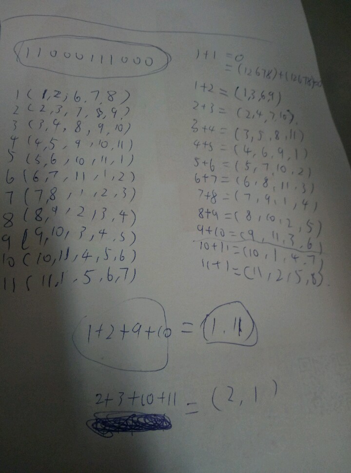 请看我自己纸上的演算,左上角的二进制表示五个线条对应的球的位置,当以1号为起点的时候,发生变化的球是1.2.6.7.8号这5个球。以此类推,11个球分别为起点都会对应5个球发生变化。