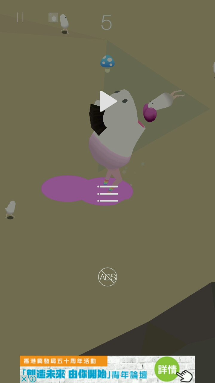 粉紅色的蘑菇是暫停,綠色的蘑菇是加速,藍色的蘑菇是變大,所有有感嘆號的都不能接近。(乂`д´)可以吃小花小草岩石,它們會變成小跟班跟著你。服裝也很可愛,場景也會隨著服裝而變。♡-(๑˙ー˙๑)-♡