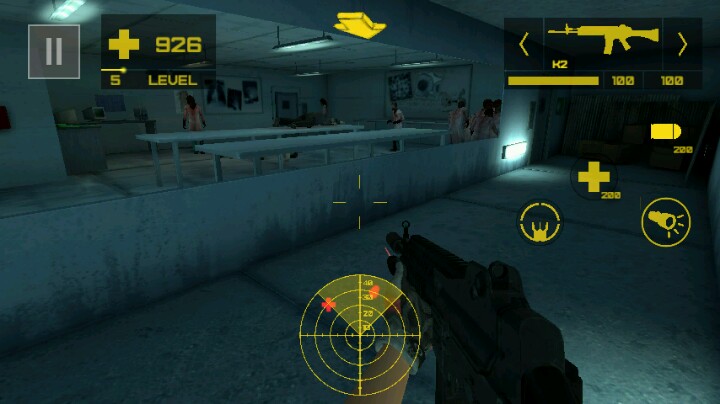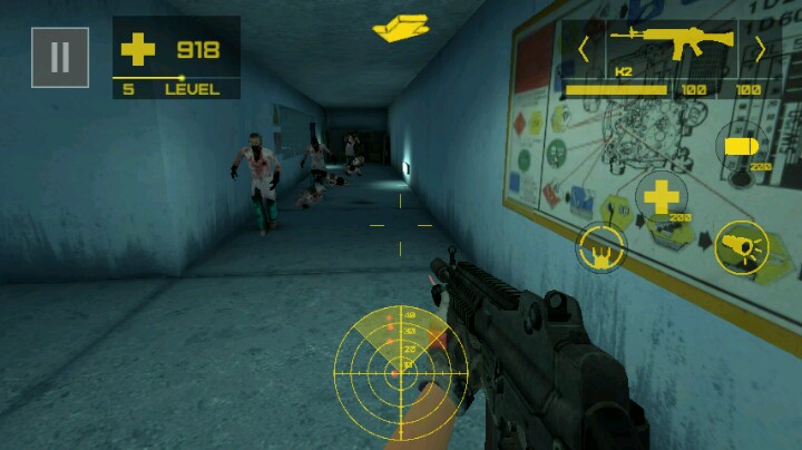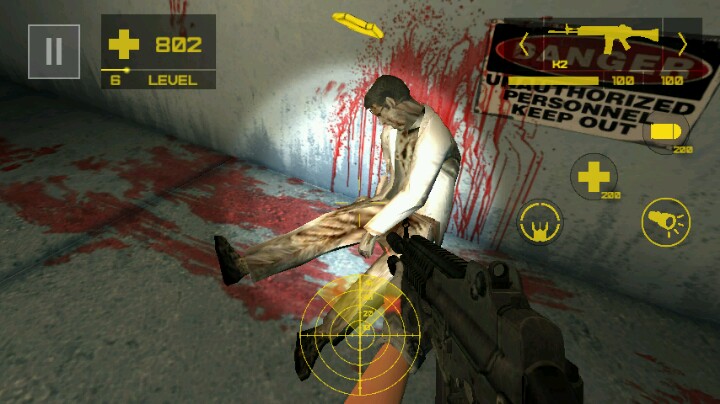 话说,一个生物地下实验室里,你举着一把手枪缓缓前行,在正下方的雷达测试仪提醒你到实验室去拿血包!