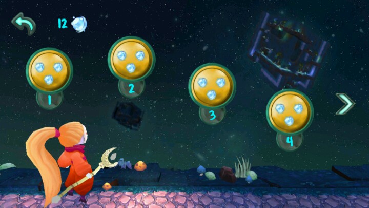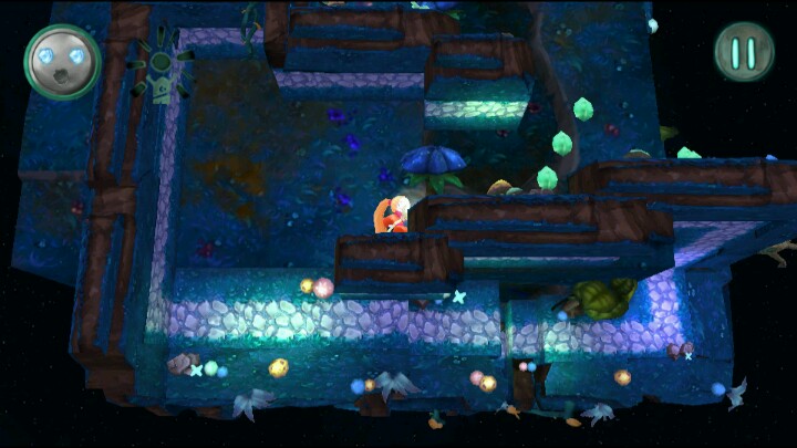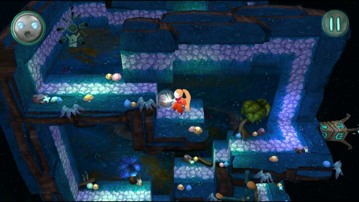 刚才本人以女主视角简单介绍了这游戏。简单来说,游戏目标是让黑暗迷宫中的她找到光明。左右滑屏使女主行走,点击右侧屏幕使她跳跃,走到一个很亮的出口处通关。收集绿色宝石增加评分,收集蓝色球体解锁新关卡。另外本作的迷宫是3D的,而且女主可以跨越两个平面(注意图3和图4的视角)。当然除了这些,还有尖刺、怪物等危险等待着她,一起来和橙发少女寻找光明的出口吧~