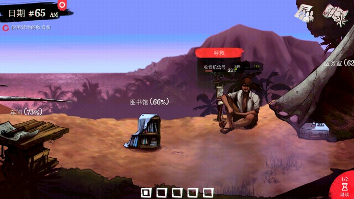 刚刚65天通关。虽然结局有点恶搞,但也不去吐槽了。先分享一下我能想到的心得。 首先,开局先看技能,负面(红色)技能 如果多的话就重开,看见贪吃技能也重开。 然后,把能造的造出来,搜索飞机一天一次差不多。探索丛林有人就去,但是,探索地图里的资源除了鱼和肉以外都可以马上拿,鱼肉等到中期吃的不够了再拿。前期靠飞机上的东西就够吃了。 接下来,速度把果篮、鱼竿造出来。然后,游戏最难的部分到了,在鱼竿造出来之后就要开始烤鱼,木材此时就不够用了。所以,不要一直烤鱼,每天烤一两条给体质差的人吃(比如小女孩),体质好的生吃就行。地图上的木材让搜索能力强的去。把烹饪器憋出来(真的是bie出来!)就可以松口气了。此时,生吃鱼肉的后遗症就来了――疾病。所以,不要造猎弓、烘干器了,直接出诊所。疾病有个特点就是有机率传染,并且每天都会增加。所以一旦有人得病就要马上治。诊所出来以后,就轻松了。后期就是主线剧情有点难,把朱丽叶(男主的情人)培养起来,基本上就靠他打boss。 还有一个就是人物关系的培养,人物关系高,办事效率就高。男主和朱丽叶一起(用来收集工具)。Bob和那个瘦老男人一起(钓鱼)小女孩他爹做饭,其他随意。培养关系就是形影不离,你干啥我干啥(有点夸大了),每天晚上的事件也会影响关系。其他,有什么建议欢迎交流。