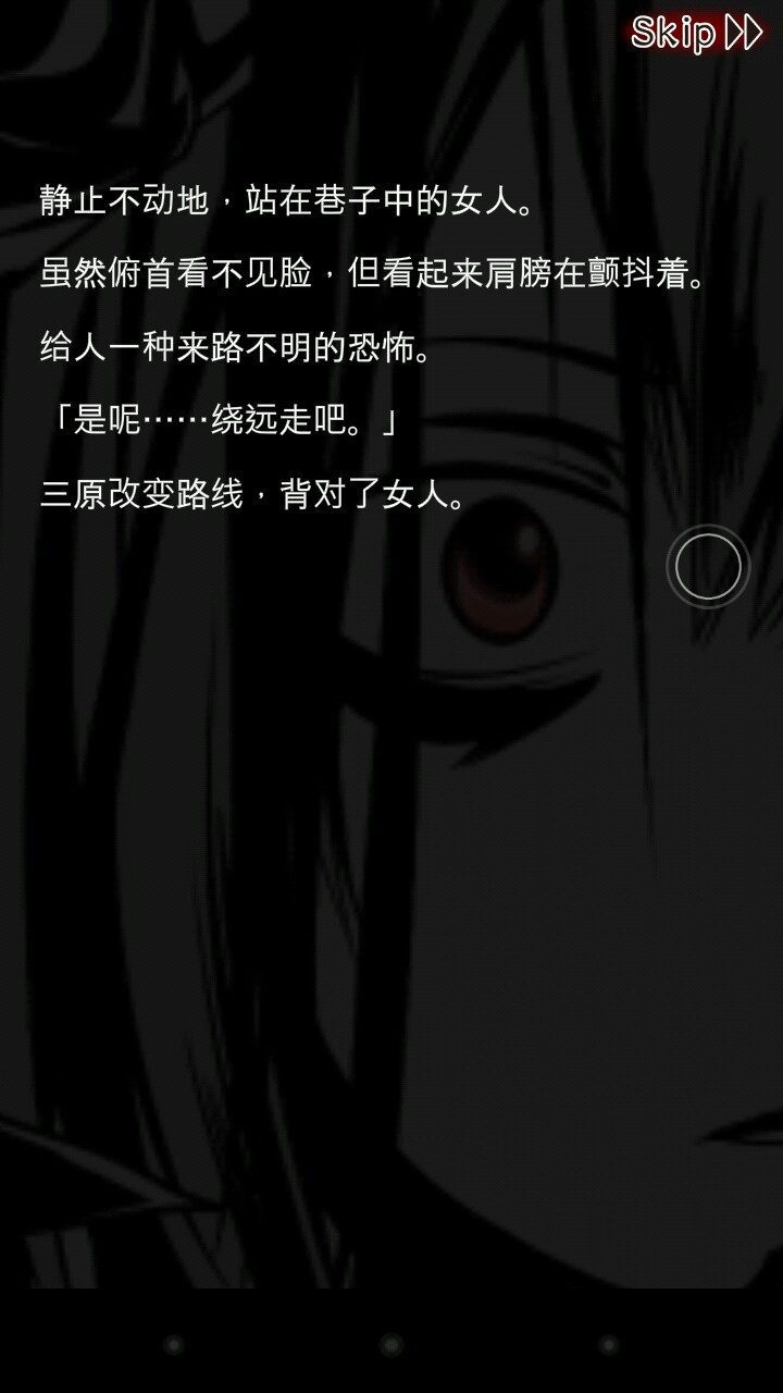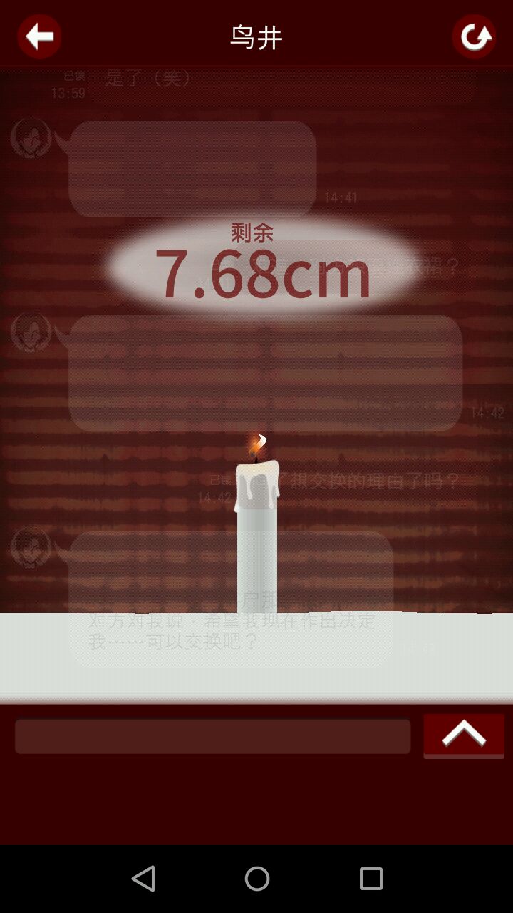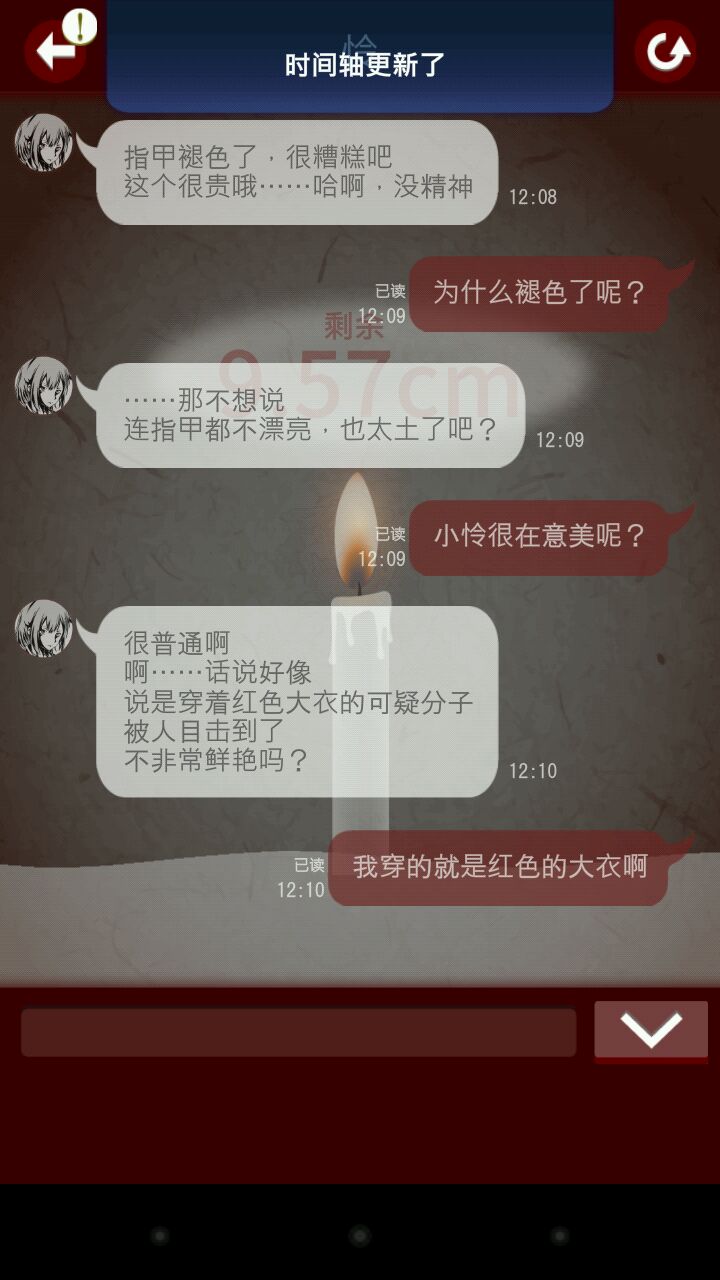 还有,在遇到关键选项,也就是三个选项中,有一个会让角色死亡的选项时,蜡烛会变小并且摇摆不定,这是提示,死亡后火苗熄灭,并且死亡或是活下来都会有一小段漫画配文字的剧情。