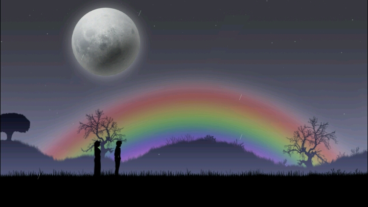 首先说下画面吧:以深蓝色为主的夜空、白色的圆月、微微闪烁的星星、灰黑色的山峦……很不错呢。