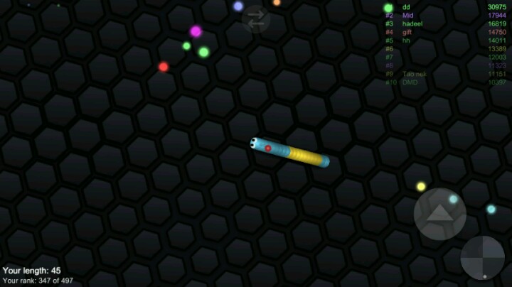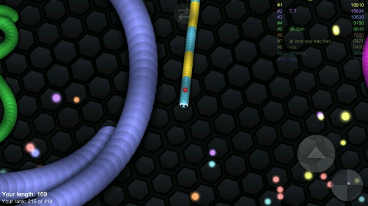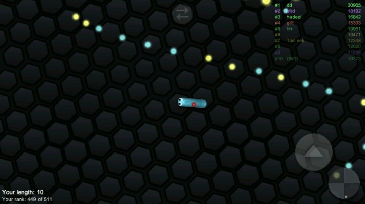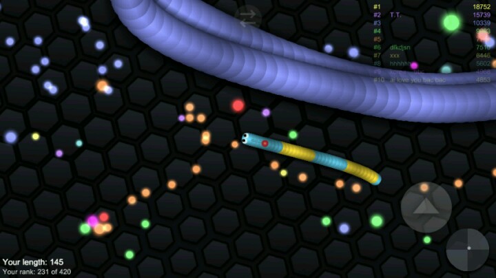 整个游戏都给我一种简单 清新的赶脚 也许许多玩家一进去看到英文和我是一样懵逼的。。 但其实这游戏比我们想象中的更简单 一开始我进入游戏后 便是吃豆豆 吃着吃着便来到了战场 下图(只见一庞然大物) (╯°Д°)╯︵ ┻━┻ 尼玛很吓人有木有 而且没错的话居然是进食画面 可怜我们绿色小虫(应该是虫子吧) 玩着玩着便觉得好玩 挺休闲的游戏喂(๑•́ ₃ •̀๑) 我便发疯一样的玩了一下午 便发现这游戏的规则 1.操作有多种 右下按钮可加速 其他操作和球球很类似2.只要敌人碰到你身体他便会变成好多的小球球(食物 下图就是对手是用的缠斗 让对手无路可走)3.加速会在身后留下印记 也是小豆子 (所以越用越小 看你吃的多不多了)4.对手真的很狡猾。。 本来很大的碰到小的而死这种事经常发生(我没浪 我真的没浪 他们加速到我前面真的好阴额o(▼皿▼メ;)o) 总之这是个非常好玩的休闲游戏 对于手机的配置不高 且不会坑钱 虽说有广告 但那都是死亡后随便弹的 叉掉即可继续食用