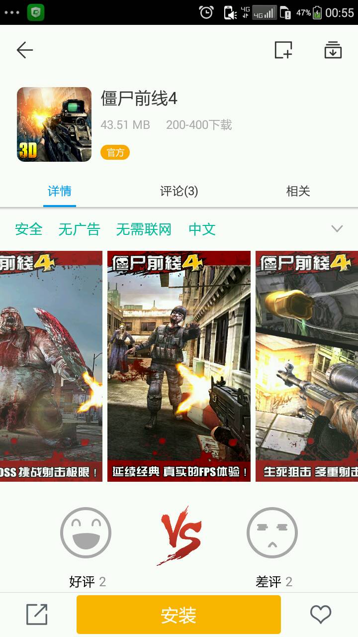 游戏下载后会出现两个图标,没错就是两个,不知道是什么鬼,点击第一个图标才是主程序,貌似第一次进入游戏需要联网验证什么资源,我看到网络使用量很大,第一次会无法点击屏幕,耐心等待不到两分钟就可以了,然后退出游戏关闭网络,不然死一次出现一次广告的……