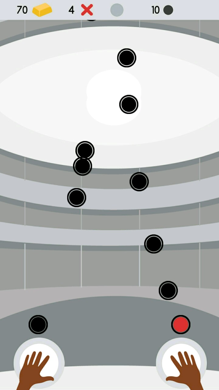 游戏玩法还是很有创意的~类似于下落式的太鼓。但是游戏不像其它下落式音游有判定线,演奏的节奏完全需要自己掌握。而且你不要以为这样判定就会松啊,一点也不,想押到10很不容易的。不过嘛,到后期我反正是完全顾不上节奏了,完全是追着音符跑呢(¯Д¯)ノ。。