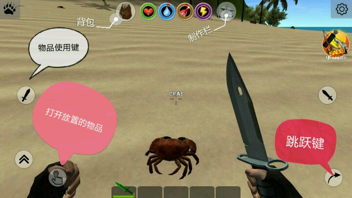 食物获取:刚开始时只有一块生肉,我们可以拿小刀打螃蟹获取肉(我还没想清怎么捡起),你还可以到海边拾捡罐头、水之类的食物(看运气),到后期可以拿枪、弓等武器猎杀动物