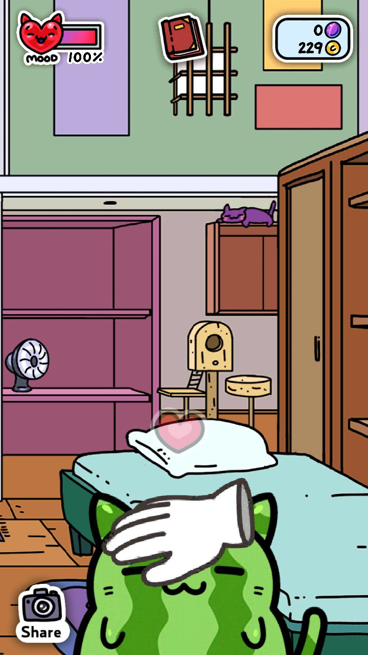 游戏主要玩法就是让猫咪带回东西来收集它们,再通过赚来的钱买新的猫咪,当然也可以在服装小店买装饰品给猫咪穿戴~通过喂食、抚摸增长猫咪的心情(左上角)有几率让它带回更好的东西更多的钱哦~它出门的时候还可以点击右下角玩点泡泡游戏赚点金币