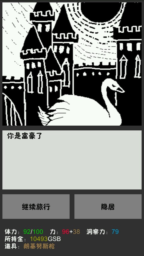 看看游戏胜利的条件,我是达到了10000块,可以选择继续旅行,也可以选择隐居,选择隐居后,游戏就结束了。。