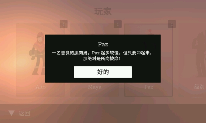 啦啦啦~在一阵努力加运气爆棚的结果下,成功升到二十一级,于是又解锁了个人物,叫Paz。先试玩了下,系统对于Paz的评价是:一名善良的肌肉男【╮(╯_╰)╭】,起步较慢,但是冲起来所向披靡~