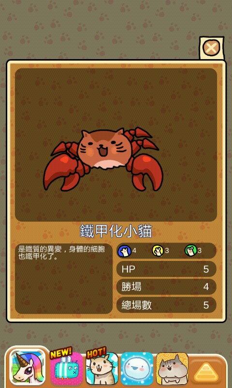 无意中被安利了款猫咪进化&收集的游戏,本来最开始以为只是简单的不同软萌的猫咪进化而已 ( ಠ_ಠ),本着荤素搭配,营养实惠的原则喂养了一只,怎么长着长着就残了呢 థ౪థ快告诉我这只金刚大蝎子不是由那只换了脑袋的螃蟹进化来的!虽然野外遇到打架厉害点(误),不过这打架也就是石头剪子布也玩出花儿了啊!