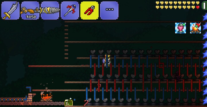 首先,就是做一个较宽的平台放满压力盘,然后上下放两排平台,注意平台的间隔,然后上下都放满心形雕像,我下载的版本大概是这次更新之前的版本,具体的不记得了,有个建筑药水的bug,所有放置的东西都不会消耗,所以你有一个心形雕像就够了。